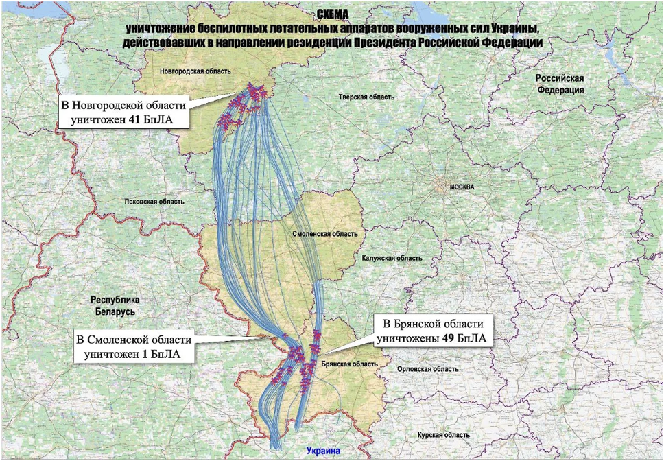Нанесение удара противником, как показано на представленной карте, осуществлялось по нескольким направлениям к резиденции президента России над территориями Брянской, Смоленской, Тверской и Новгородской областей.
