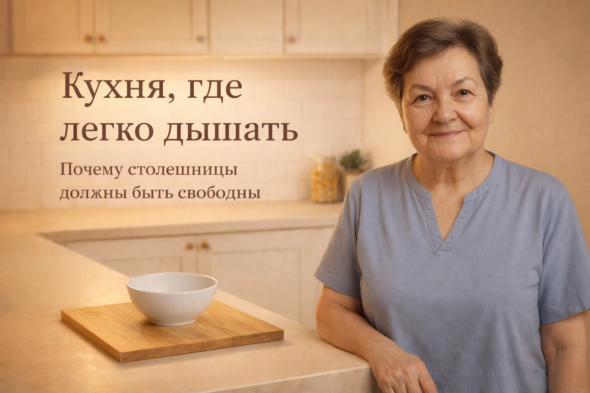 Это снова ваша Баба Люба. Иногда заходишь на кухню — и будто воздуха не хватает. Вроде всё нужное под рукой, техника современная, а стоять там тяжело. Хочется быстрее уйти, ничего не готовить, ничего не начинать. И редко кто связывает это с самым простым — со столешницей. Раньше кухни были меньше, а дышалось в них легче. Не потому что жизнь была проще, а потому что поверхности были свободны. На столе — только то, с чем сейчас работают. Остальное ждёт своего часа в шкафу. Бабушки не оставляли всё «на виду» не из строгости и не ради красоты. Они чувствовали: когда перед глазами много предметов, голова устаёт быстрее. Каждая банка, каждая коробка, каждый прибор будто тихо требует внимания. И человек, сам того не замечая, всё время напряжён. Свободная столешница даёт ощущение паузы. Глазам есть где отдохнуть. Мысли не цепляются за мелочи. Даже готовка идёт спокойнее, без суеты. Не потому что