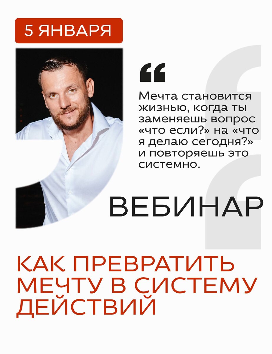 5 января я проведу открытый вебинар, благодаря которому 2026 станет вашим самым результативным годом: КАК ПРЕВРАТИТЬ МЕЧТУ В СИСТЕМУ ДЕЙСТВИЙ — без мотивации и вдохновения, а с систематическим подходом Разберём на вебинаре: 1️⃣Почему вдохновение — плохая опора Разберём, почему мотивация нестабильна, а ожидание «правильного состояния» годами откладывает реальные изменения. Покажу, чем заменить вдохновение, чтобы движение стало регулярным. 2️⃣ Как перевести абстрактные желания в конкретные шаги Мечта → цель → действия. Разложим желания на понятные и выполнимые шаги, уберём хаос и перегрузку, чтобы стало ясно, что делать уже сейчас, а не «когда-нибудь». 3️⃣ Система вместо усилий: как действовать без надрыва Покажу логику Самоорганизации: как выстраивается дисциплина, привычки и приоритеты так, чтобы результат появлялся не за счёт силы воли, а за счёт системы, которая работает на вас. Хочешь, чтоб мечты перестали быть обещаниями самому себе и начали превращаться в РЕЗУЛЬТАТ? 🔥 Прис
