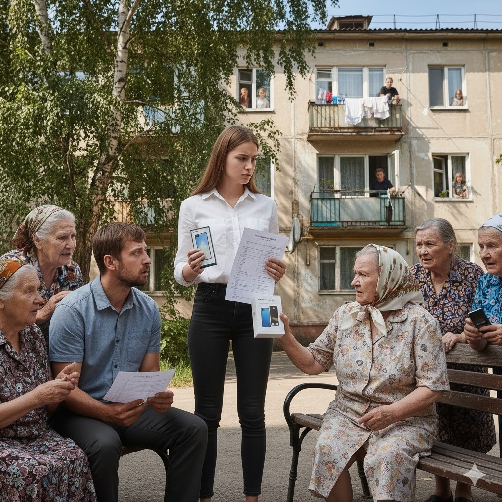 Воздух во дворе, казалось, загустел. Соседки, еще минуту назад готовые распять Ксению, замерли. Антонина Васильевна попыталась вскочить, её лицо пошло красными пятнами, а рука, тянувшаяся к коробке с новым телефоном, мелко задрожала.