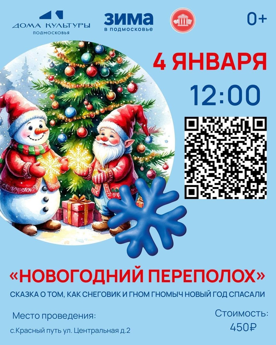 ✨ СДК «Русь» приглашает ❄️❄️❄️❄️❄️❄️❄️❄️❄️ «Новогодний переполох» - новогодняя сказка для детей. ❄️❄️❄️❄️❄️❄️❄️❄️❄️ Приходите всей семьёй за новогодним настроением! ❄️❄️❄️❄️❄️❄️❄️❄️❄️ Билет можно приобрести по куар коду на афише☝️ 🚫 Возраст: 0+ 📆 04.01.2026🕒12:00 🏢 Сельский дом культуры (СДК) «Русь» 📍 г.о.Домодедово, с.Красный Путь, ул.Центральная, д.2 💰 Цена: 450 ₽ ✅ Мероприятия Домодедово https://dzen.ru/id/66f10385cc4c5a16f7b5fb02 http://vk.com/domodedovo_events http://dzen.ru/domodedovo_events