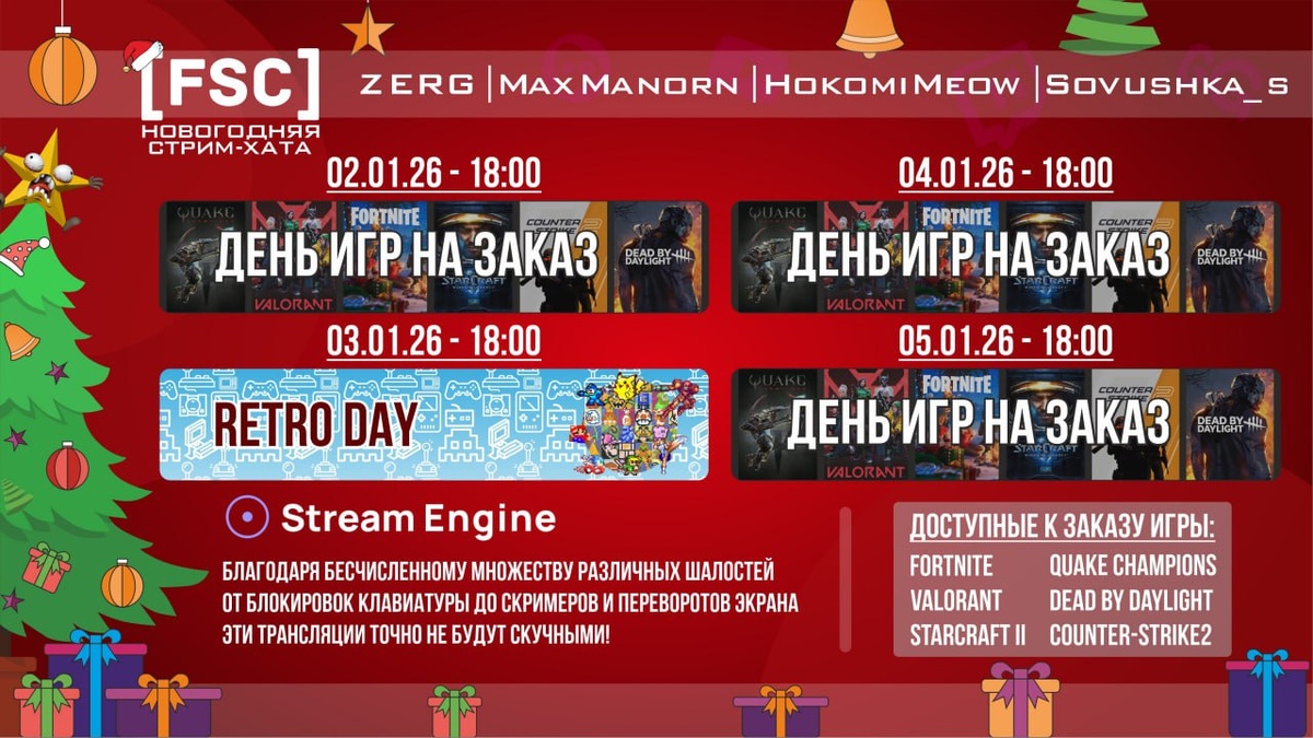 😀😃😀😆😃😍 📢📢 🎄 [FSC]НОВОГОДНЯЯ СТРИМХАТА 🎄 🎄 MaxManorn 🎄 ZERG 🎄 HokomiMeow 🎄 Sovushka 🎄 и другие... 🎮 "ДЕНЬ ИГР НА ЗАКАЗ" |ИНТЕРАКТИВ|ИГРЫ СО ЗРИТЕЛЯМИ|РОЗЫГРЫШЫ| 🎮 "ИГР НА ЗАКАЗ" Список игр доступных к заказу: Fortnite, VALORANT, StarCraft II, Quake Champions, Dead by Daylight, Counter-Strike2. На каждую игру будет выведен сбор, при закрытии сбора на определенную игру, играем в нее следующий час! Допускается дополнительный заказ и продление игры при повторном закрытии сбора. Если в рамках стрима не получилось выполнить все заказы они переносятся на следующий день, не включая "RETRO DAY". ‼️Все дни будут работать "шалости" от Streamengine. Вы сможете перевернуть экран, отключить клавиатуру, поменять клавиши и многое другое определенному стримеру или всем вместе! 😄 ШАЛОСТИ: СЮДА 💌 ДОНАТЫ И ЗАКАЗ ИГР: ТУТ 1️⃣ Приходите смотреть на каналы участников!!! 🔆 Прожимай "Отслеживать" (Follow) это бесплатно для тебя и важно для каналов!