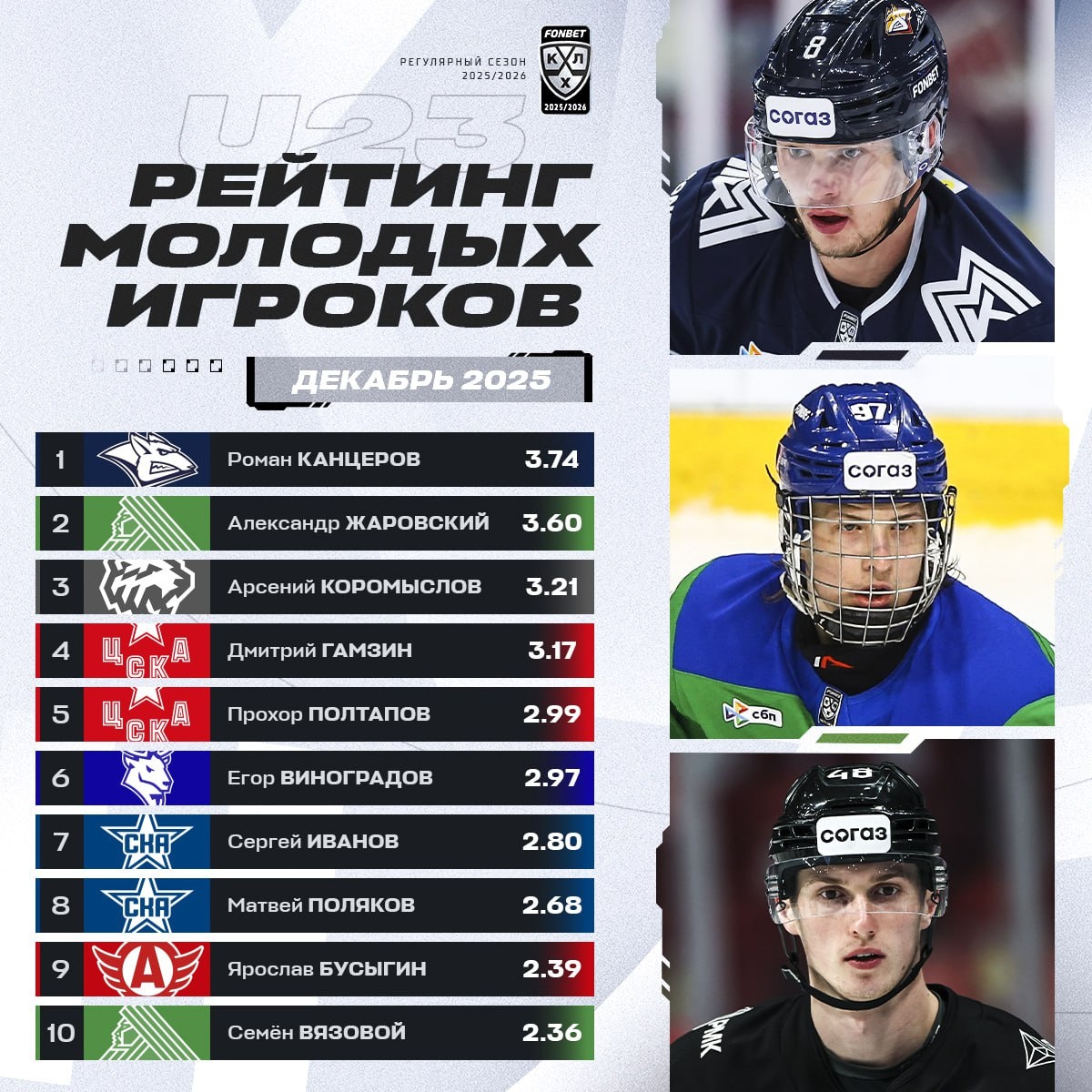 Канцеров, Жаровский и Коромыслов вошли в тройку лидеров Рейтинга молодых игроков в декабре.