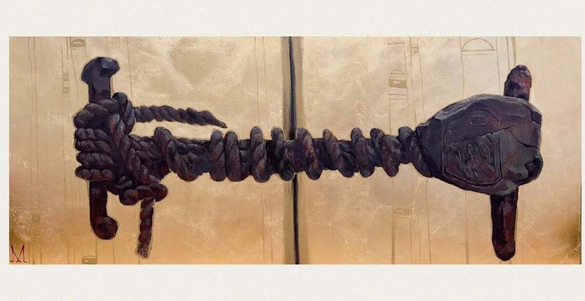 » холст, масло, золочение | 45 x 120 см | 2025 г. В 1922 г. неподалеку от Луксора английский археолог Говард Картер обнаружил гробницу Тутанхамона, совершив тем самым одно из главных археологических открытий XX в. Сохранность захоронения была феноменальной. Среди находок было множество золотых предметов, однако научной сенсацией стала эта глиняная печать на веревке, скрепляющей между собой две медные ручки на внутреннем ковчеге фараона. Если во внешних помещениях гробницы ученые обнаружили следы расхитителей, то сохранность этой печати в течение 3245 лет свидетельствовала о том, что важнейшая часть гробницы все эти годы оставалась нетронутой. Перед дальнейшими исследованиями была сделана фотография артефакта, и Артур Мирзоян изображает его со скурпулезностью учёного, отдавая дань не только триумфу археологии, но и древней тайне: на этой картине из цикла «Пробуждая титанов» печать останется неприкосновенной навсегда. Картина доступна к приобретению #АртурМирзоян