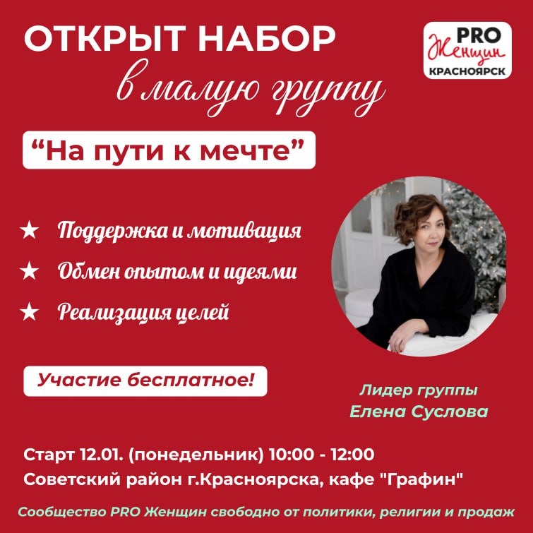 "НА ПУТИ К МЕЧТЕ" Участие безоплатное! 🎁 Группа поддержки для женщин, которые хотят воплотить свои мечты! Возможно ты ещё даже не веришь, что твоя мечта может исполниться, а совсем небольшие действия, поддержка и помощь, помогут тебе приблизиться к ней. А может тебе не хватает одного единственного решительного шага, чтобы твоя мечта наконец-то сбылась? На наших встречах можно: ✅ Мечтать и воплощать задуманное ✅ Поддерживать и мотивировать друг друга ✅ Заряжаться на дальнейшее движение ✅ Сделать реальные шаги на пути к своей мечте Группа будет проходить по методологии сообщества PROЖенщин, которая уже зарекомендовала себя как рабочая и результативная! ✔ Старт 12 января 10:00 - 12.00 ✔ Встречи по понедельникам ✔ Еженедельно, 8 встреч ✔ г.Красноярск, район Взлетки ⭐️ Если хотите присоединиться или задать вопрос, пишите лидеру группы Елене Сусловой в личные сообщения t.me/Elena_dom_v_melochah В малых группах нашего сообщества Вы получите мощный ресурс - поддерживающее окружение с ц