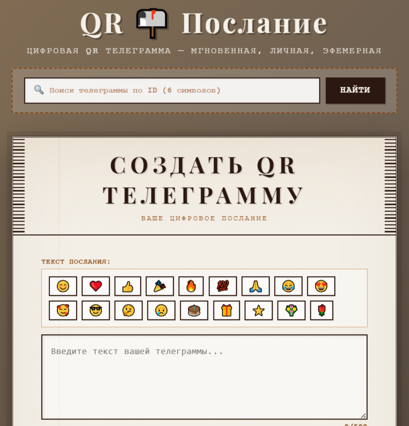 Представьте: вы пишете текст на сайте, система генерирует красивый QR-код, оформленный как настоящая советская телеграмма - с печатями, штампами, пожелтевшей бумагой. Вы распечатываете это на принтере, вручаете человеку, он сканирует код телефоном и читает ваше послание.