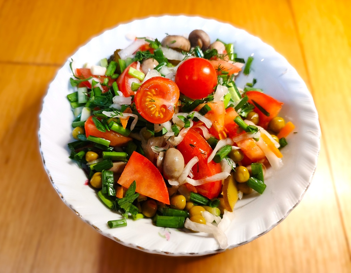Такой салат вполне может соперничать с винегретом. Зимой идет на Ура! Выглядит нарядно и аппетитно, а значит подойдет и для праздничного стола. Количество продуктов не указываю, берите на свое усмотрение, в этом случае полная свобода! ИНГРЕДИЕНТЫ: ПРИГОТОВЛЕНИЕ: 1. Соленый огурец и помидор нарезать, добавить к капусте 2. Затем положить грибы и зеленый горошек 3. Порезать лук, добавить его в салат, заправить растительным маслом. Салат готов. Большое спасибо за внимание! Рецепты от Елены на любой вкус. https://rutube.ru/channel/24544534/ https://vkvideo.ru/@club232602375
