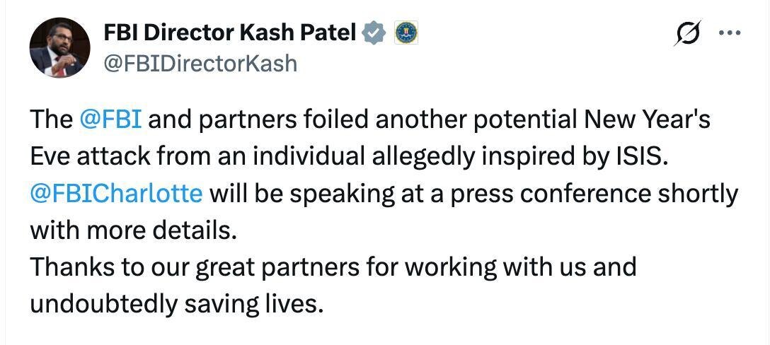 Kash Patel claims the FBI foiled a New Year’s Eve terror plot ‘from an individual allegedly inspired by ISIS’