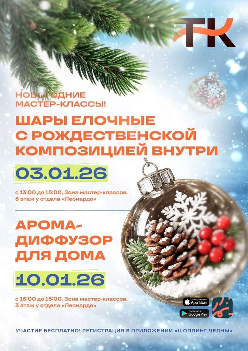 ?🎄 ✨ 3 января 🎄 Ёлочные шары с рождественской композицией внутри 📌 Регистрация с 30.12.2025 ✨ 10 января 🌿 Аромадиффузор для дома 📌 Регистрация с 05.01.2026 📍 ТРК «Торговый квартал» 3 этаж, зона мастер-классов, у отдела «Леонардо» 🆓 Бесплатно 🕐 с 13:00 до 15:00 ❗️ Обязательна регистрация в приложении «Шоппинг Челны» 🚌 Экскурсия «Остановка: Парки» Продолжаем новогодние экскурсии. Отличный старт празднования 400-летия Набережных Челнов. Поедем на брендированном автобусе МУП «Горкоммунхоз» и погрузимся в историю города. ‼️ Обязательна регистрация (места быстро заканчиваются): 📅 4 января 🕙 10:00 🆓 Бесплатно 📍 Место сбора: мемориал «Родина-мать» 😃 Подписывайся на most| Набережные Челны | Пришли свою новость