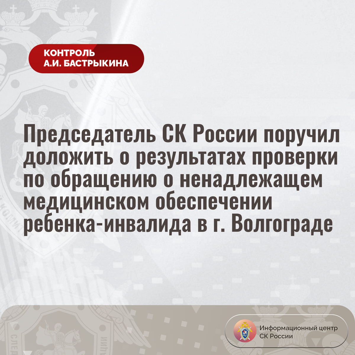 Председатель СК России поручил доложить о результатах проверки по обращению о ненадлежащем медицинском обеспечении ребенка-инвалида в г. Волгограде К Председателю СК России А.И. Бастрыкину в его приёмную в социальной сети «ВКонтакте» обратилась жительница города Волгограда по вопросу нарушения прав ее трехлетнего сына-инвалида, имеющего паллиативный статус, на качественное медицинское обеспечение. Для поддержания здоровья мальчик, страдающий редким заболеванием, нуждается в регулярном приеме специализированного лечебного питания и лекарственных препаратов. Однако необходимыми медикаментами он не обеспечивается, ввиду чего заявительница вынуждена приобретать их за свой счет, что для нее финансово затруднительно. Обращения в профильные структуры результатов не принесли. В СУ СК России по Волгоградской области организована процессуальная проверка. Председатель Следственного комитета Российской Федерации Александр Иванович Бастрыкин поручил руководителю СУ СК России по Волгоградской облас
