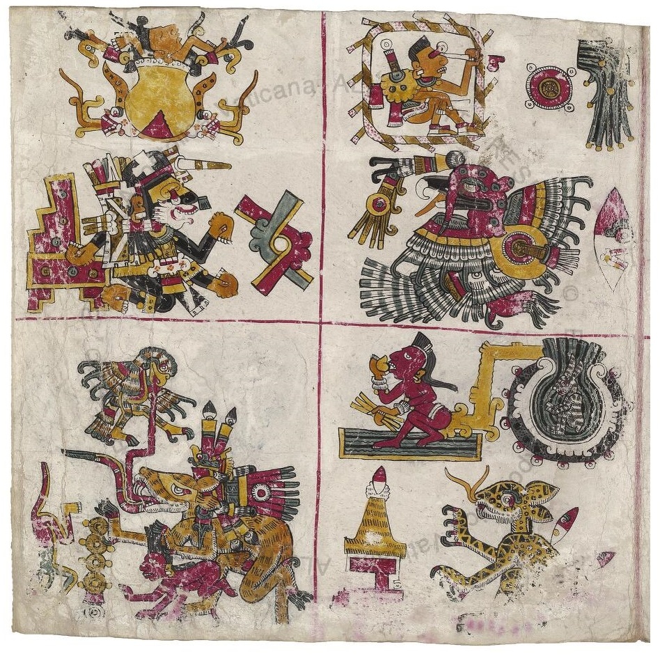 Перед нами страница из кодекса Борджиа (XIII-XV века), известной книги из Мезоамерики. Книга была создана индейцами из конфедераций Тольтека-Чичимека (современные мексиканские штаты Пуэбла и Тласкала) и не содержит текста, только "изображения". Книга посвящена священному 260-дневному календарю, или тональпоуалли, который был разделён на 20 периодов по 13 дней каждый. День в этом календаре обозначается числом (от 1 до 13) и символом или дневным знаком: 1 — аллигатор, 2 — ветер, 3 — дом, 4 — ящерица и т. д. Каждый дневной знак посвящён богу или стихийной силе, источнику жизненной энергии тональпоуалли на этот день. На странице 10 календаря (см. рис. вверху) показаны 4 дневных знака и соответствующий им (ацтекский) бог. Каждая четверть страницы содержит дневной знак, божество и другие фигуры. Изображенные фигуры имеют некоторую связь с изображенными богами и/или дневными знаками, но эта связь не всегда очевидна. Вверху справа: дневной знак «Кремень» с богом Чалчиутотолином, «Нефрит