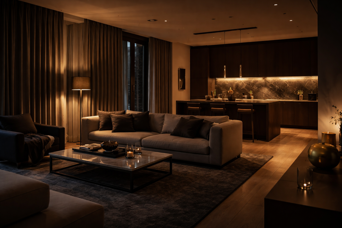 Равномерно, ярко, «как положено». В итоге квартира вечером выглядит так же, как днём.