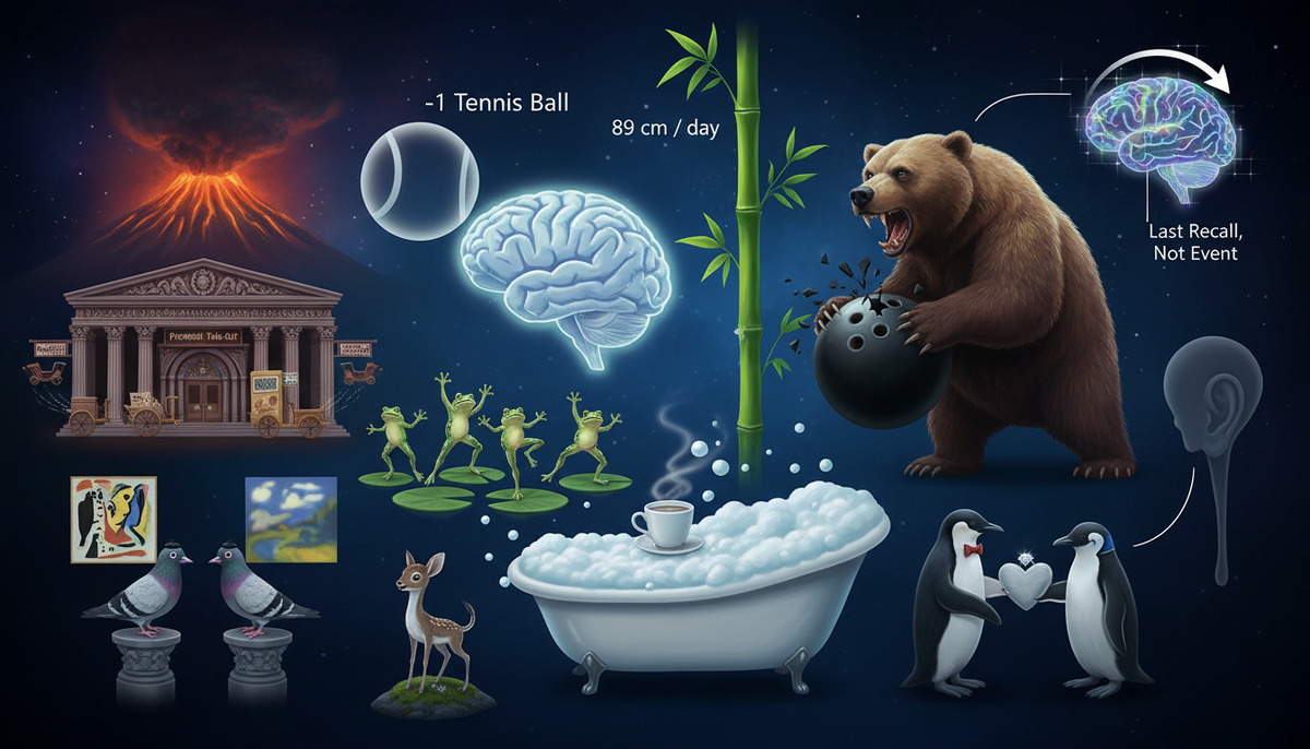 Мир полон удивительных фактов — от причудливых привычек животных до загадок человеческого тела и разума. Некоторые из них вызывают улыбку, другие заставляют задуматься, а третьи просто оставляют с открытым ртом. В этой подборке вы найдёте немного обо всём: науку, природу, историю и даже философию памяти — всё это подано с лёгкой иронией и любопытством к необычному в обычном. Человеческий мозг уменьшается в размерах. За последние 10 000 лет его масса стала меньше на один теннисный мяч. К счастью, это не повлияло на умственные способности людей. У медведей гризли такой сильный укус, что они могут раздавить шар для боулинга. Вот почему вы почти никогда не увидите, как медведи гризли играют в боулинг. Один из видов бамбука является самым быстрорастущим растением на Земле. Он вырастает на 89 сантиметров в день. В 2014 году учёные открыли 14 новых видов танцующих лягушек, доведя их общее количество до 24. Может быть, они могли бы возродить хоровую капеллу. Самый большой город в мире — Токио.