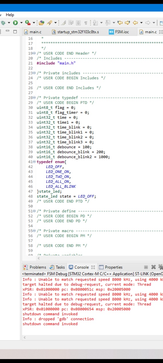 В данной функции мы собственно реализовываем fsm, с помощью switch. В качестве проверяемой переменной ставим нашу переменную state. В каждом case есть условие, которое проверяет флаг состояния. Если он равен 1, то происходит переключение на следующее состояние. При этом флаг обратно сбрасывается.