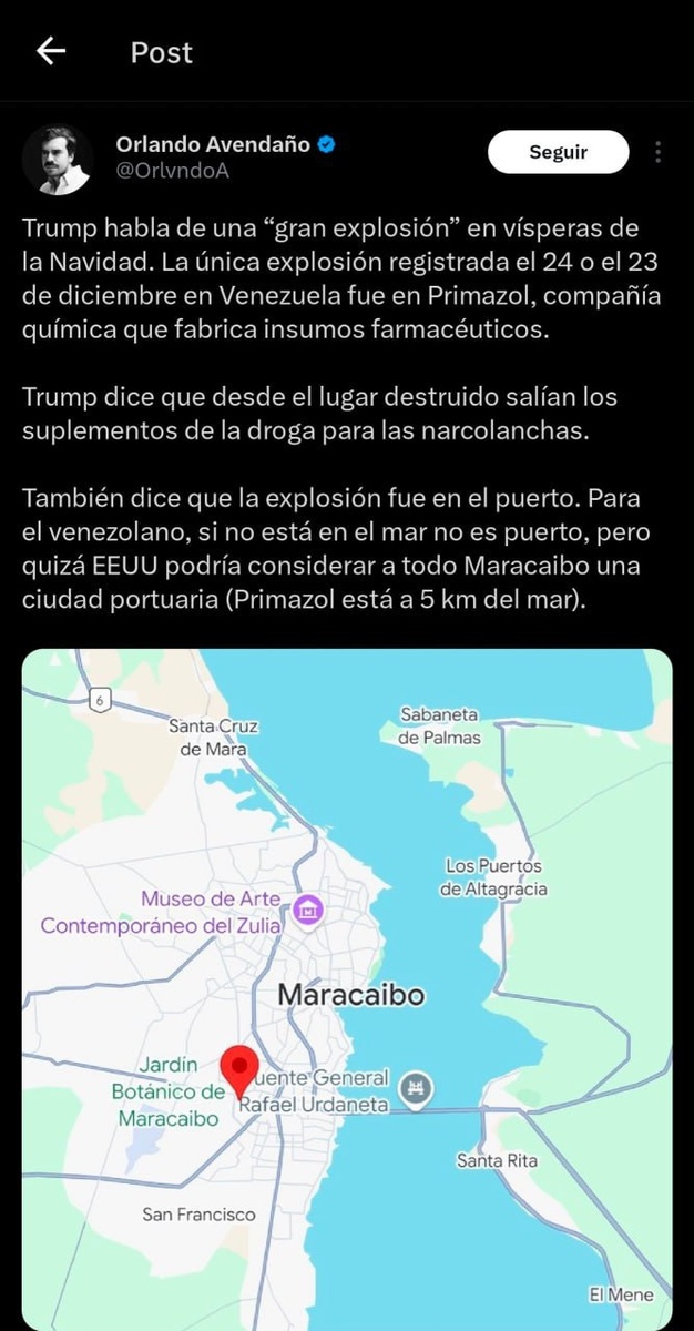 При этом конфликтующий с США президент Колумбии Густаво Петро заявил, что наземный удар ЦРУ был направлен на крупную лабораторию по производству кокаина, связанную с ELN - Национальной освободительной армией Колумбии "Мы знаем, что Трамп взорвал фабрику в Маракайбо; мы опасаемся, что они ELN) смешивают там кокаиновую пасту, чтобы сделать из нее кокаин, и пользуются расположением Маракайбо у моря. Это просто ELN. ELN, благодаря своей наркоторговле и своим идеологическим догмам, позволяет вторжение в Венесуэлу…" Густаво Петро противоречит президенту Венесуэлы Николасу Мадуро, который отрицает, что удары наносились по нарколабораториям @geonrgru | YouTube | sponsr.ru