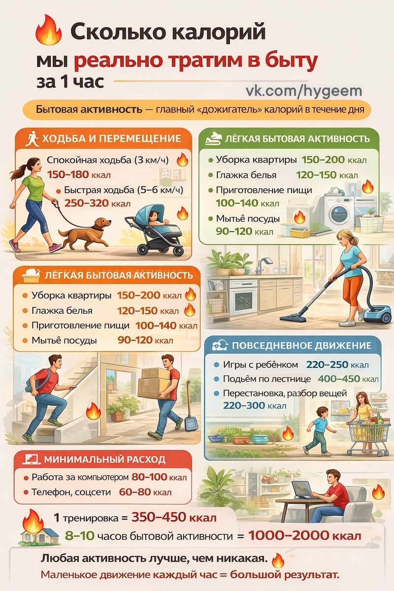 Оставшиеся калории должны «сгорать» в течение дня — во время ходьбы, домашних дел, прогулок, лестниц, обычной активности.