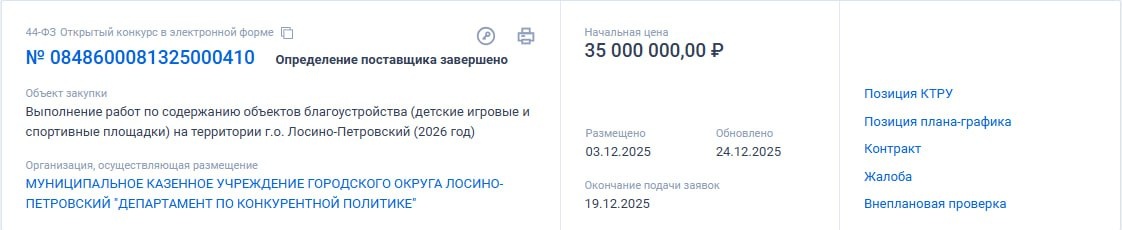 (детские игровые и спортивные площадки) на территории г.о. Лосино-Петровский в 2026 году На портале "ЕИС Закупки" размещена заявка на закупку: - 35 000 000 руб. — выполнение работ по содержанию объектов благоустройства (детские игровые и спортивные площадки) на территории г.о. Лосино-Петровский (2026 год); ⭐️ LPG