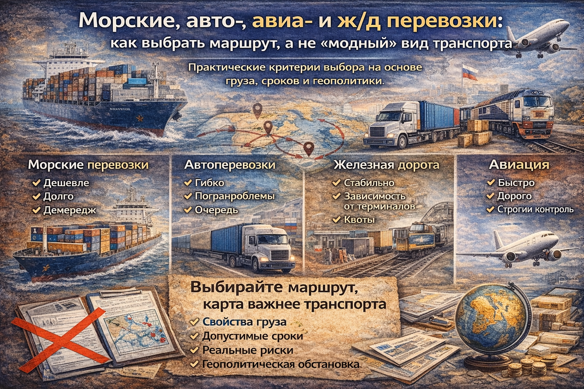— в море «потому что дёшево». Проблема в том, что универсальных решений не существует. То, что работало полгода назад, сегодня может быть источником убытков. Перед выбором маршрута я всегда отвечаю на три вопроса: Без этого сравнивать виды транспорта бессмысленно. Море остаётся самым экономичным вариантом для массовых грузов.
