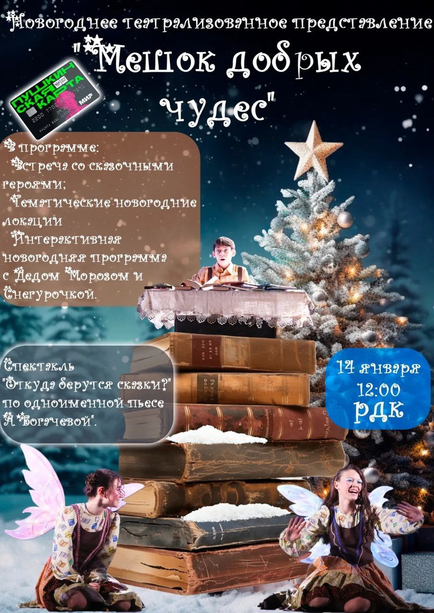 ! 🎅🎅🎅 🎅🎅🎅 14 января в 12.00 районный Дворец культуры приглашает на новогоднее театрализованное представление «Мешок добрых чудес». 🎅🎅🎅 Вас ждет встреча с Дедом Морозом и Снегурочкой, веселые игры, спектакль «От куда берутся сказки», все зрители получат уникальную возможность выиграть ВК капсулу с голосовым помощником «Маруся». 🎅🎅🎅Последнее представление! Успейте приобрести билет по ссылке 👇 https://widget.afisha.yandex.ru/w/sessions/ticketsteam-2184@53702284?clientKey=07bc5104-581a-456b-bd87-18800ad885b2®ionId=101413