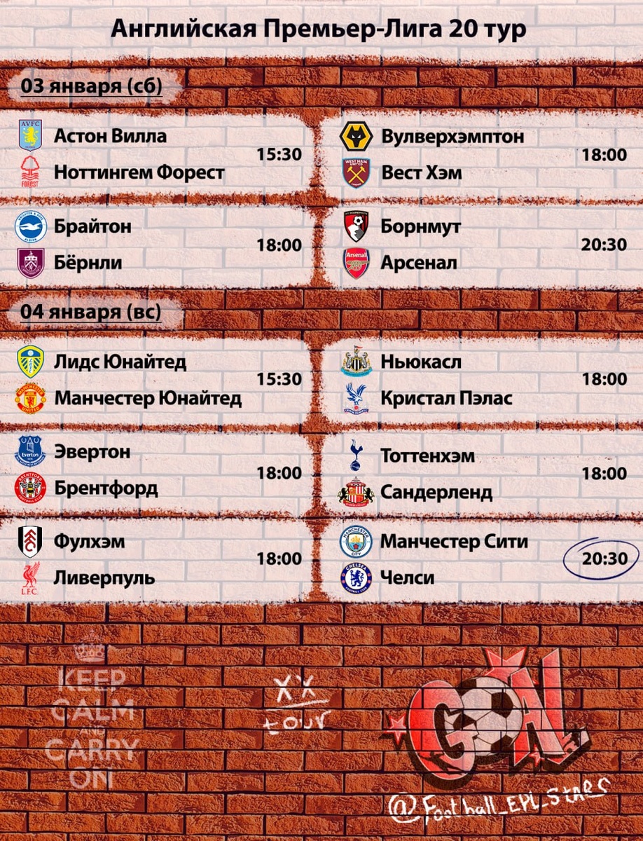 Расписание матчей 20-го тура АПЛ.