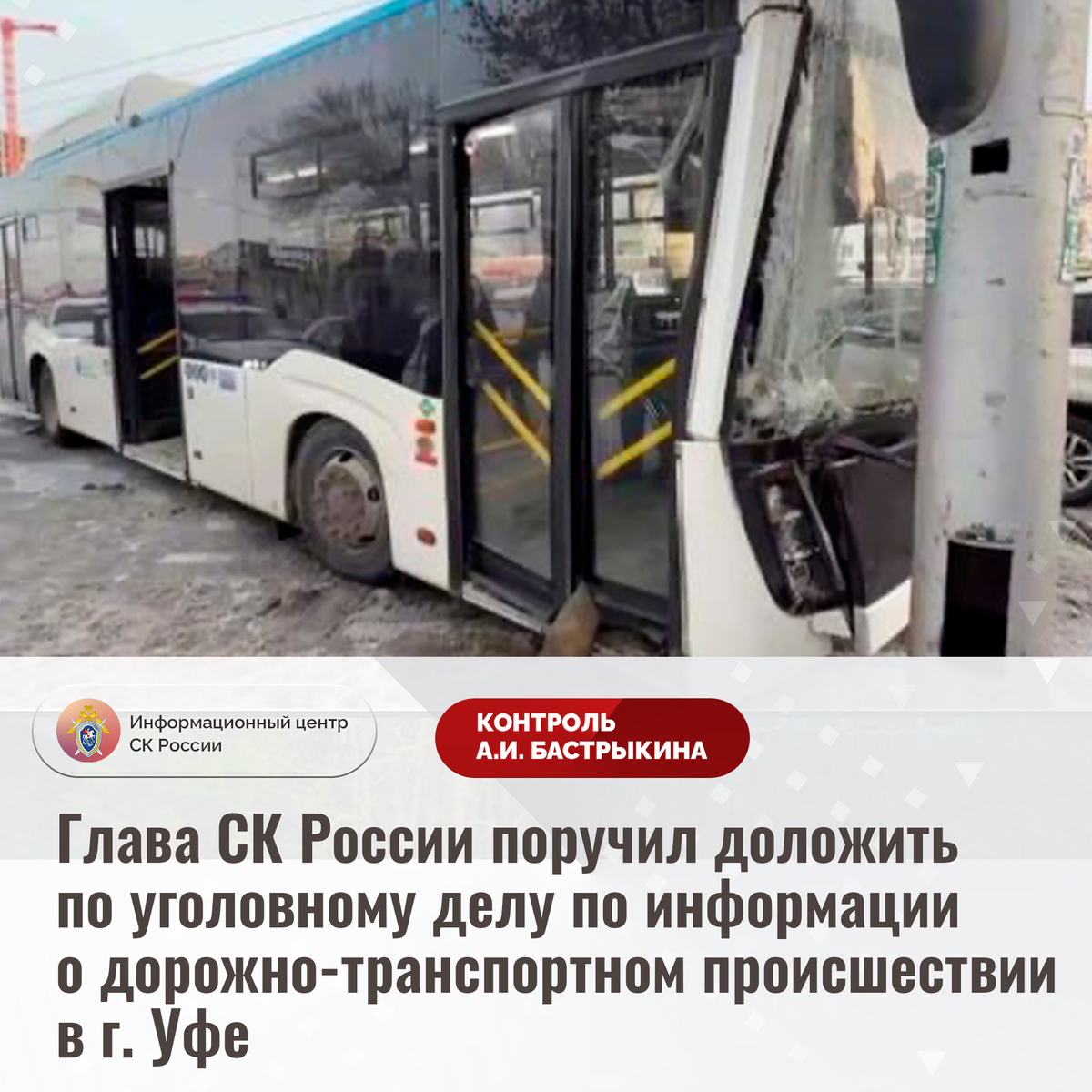 Глава СК России поручил доложить по уголовному делу по информации о дорожно-транспортном происшествии в г. Уфе В СМИ сообщается, что в декабре текущего года в городе Уфе водитель автобуса, осуществляя перевозку граждан, допустил столкновение с легковым автомобилем и опорой линии электропередач. Несколько пассажиров, в том числе ребенок, доставлены в медицинское учреждение. В СУ СК России по Республике Башкортостан возбуждено уголовное дело. Председатель Следственного комитета Российской Федерации Александр Иванович Бастрыкин поручил руководителю СУ СК России по Республике Башкортостан Владимиру Владимировичу Архангельскому доложить об установленных в ходе проведенных следственных действий обстоятельствах, а по завершении расследования уголовного дела – о его результатах. Исполнение поручения поставлено на контроль в центральном аппарате ведомства. #СледственныйКомитет #СКРоссии #СК #ИЦСКР #ИнформационныйЦентр #АлександрБастрыкин #ПредседательСКР #КонтрольПредседателяСКР #КомментарийКон