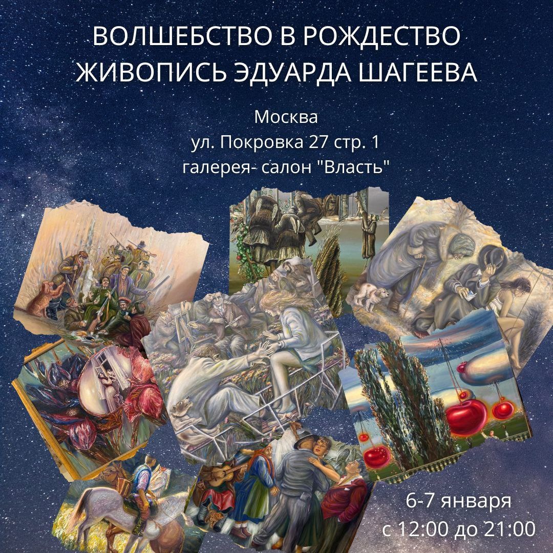 "Волшебство в Рождество". Живопись Эдуарда Шагеева Москва, ул. Покровка 27 стр. 1, Галерея-Салон "ВЛАСТЪ", 6-7 ЯНВАРЯ, С 16:00 до 21:00, ВХОД СВОБОДНЫЙ. Художник лично расскажет вам о картинах! Выставка художника сюрреалиста Эдуарда Шагеева разных временных периодов. Каждая картина — это отдельный сюжет, история, постановка. Это не просто живопись, это история чувств, страстей и эмоций внутреннего мира. Когда город затихает в предвкушении праздничного чуда, когда мороз рисует на стеклах свои эфемерные узоры, самое время прикоснуться к искусству, которое заставляет сердце биться чуть иначе. Знаете, в Москве есть такие потаенные уголки, где реальность плавно перетекает в сновидение? Одним из таких порталов в иной мир станет в начале января галерея на Покровке. Ох, это будет не просто поход в музей, а настоящее погружение в глубины подсознания! Почему стоит посетить выставку "Волшебство в Рождество" Эдуард Шагеев — мастер, чье имя давно стало синонимом глубокого и вдумчивого сюрреализ