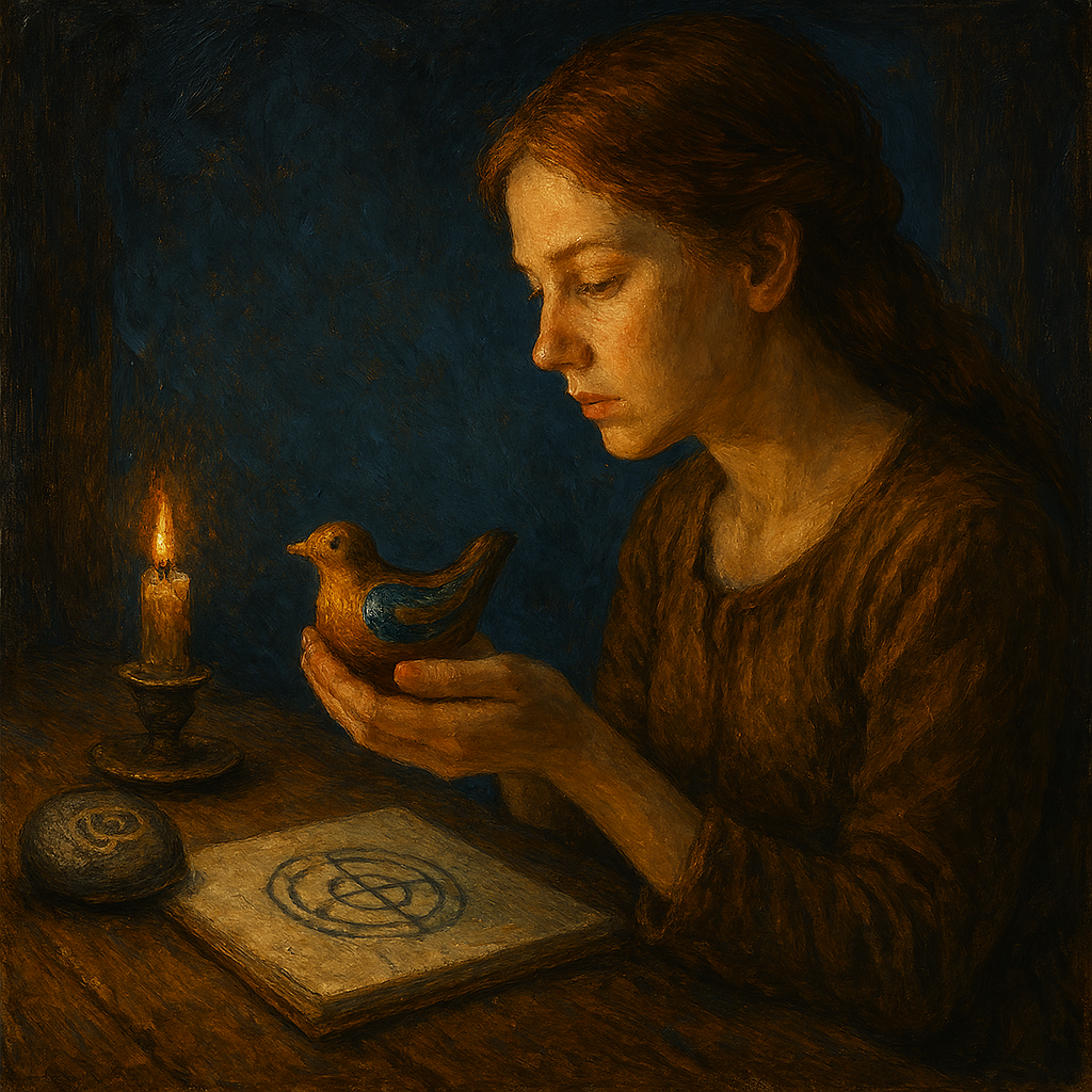 Мысль созревала медленно, как почка на дереве. Она пришла к ней не во время работы, а однажды вечером, когда она разбирала свою сумку. Высыпав содержимое на стол, она увидела их вместе: холодный круглый камень Прави, теплый, смолистый комочек от Хозяина леса (дар Нави, связывающий её с духом места), и простую, выструганную из берёзы детскую птичку — дар Алёнки, символ простой, человеческой жизни и доверия (дар Яви, связь с людьми).