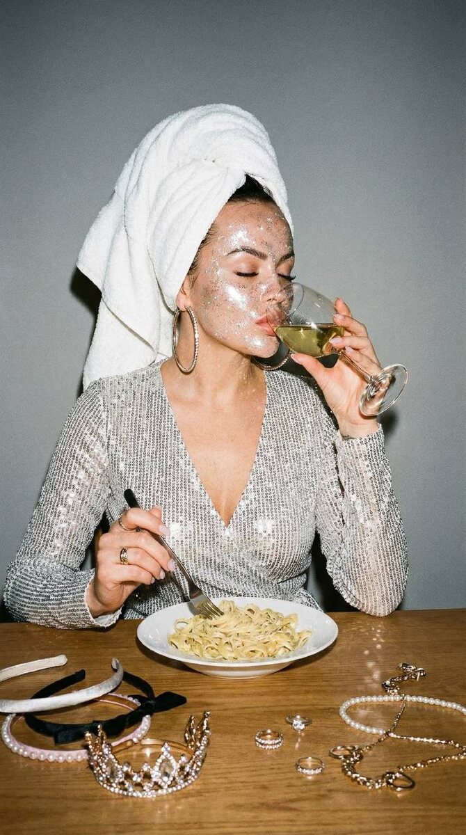 Они сидит за столом. Перед ней тарелка с пастой, несколько ободков для волос, маленькая корона, кольца, цепочки. Все это в маленьком беспорядке.