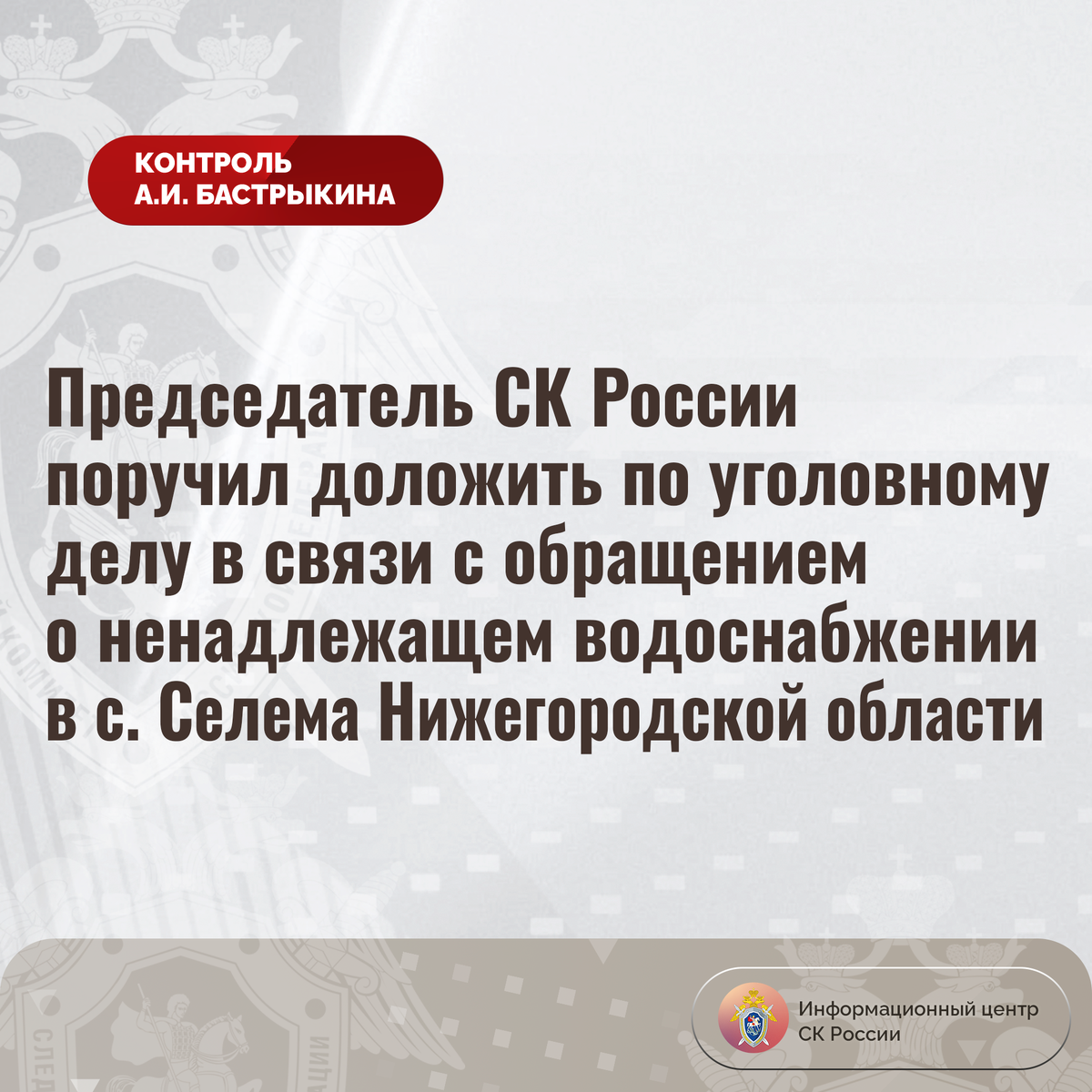 Председатель СК России поручил доложить по уголовному делу в связи с обращением о ненадлежащем водоснабжении в с. Селема Нижегородской области В Информационный центр СК России поступило обращение по вопросу продолжающегося нарушения прав жителей села Селема Нижегородской области на качественное водоснабжение. Более 15 лет в домовладения поступает жизненно необходимый ресурс, непригодный для потребления из-за наличия примесей ржавчины. В связи с этим граждане вынуждены приобретать питьевую воду за свой счет. Многочисленные обращения в уполномоченные органы результатов не принесли, содействие в разрешении ситуации не оказано. Указанная ситуация освещалась в сети Интернет. В СУ СК России по Нижегородской области неоднократно возбуждались уголовные дела, в том числе по поручению А.И. Бастрыкина. Заместитель Арзамасского городского прокурора Данил Александрович Рудаков отменил постановления о возбуждении уголовных дел. Обжалование указанных решений вплоть до прокурора Нижегородской области