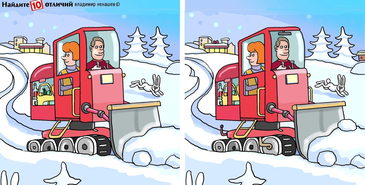 10 отличий. Тест на внимание и картинка для настроения. Домой из магазина на маленьком бульдозере.