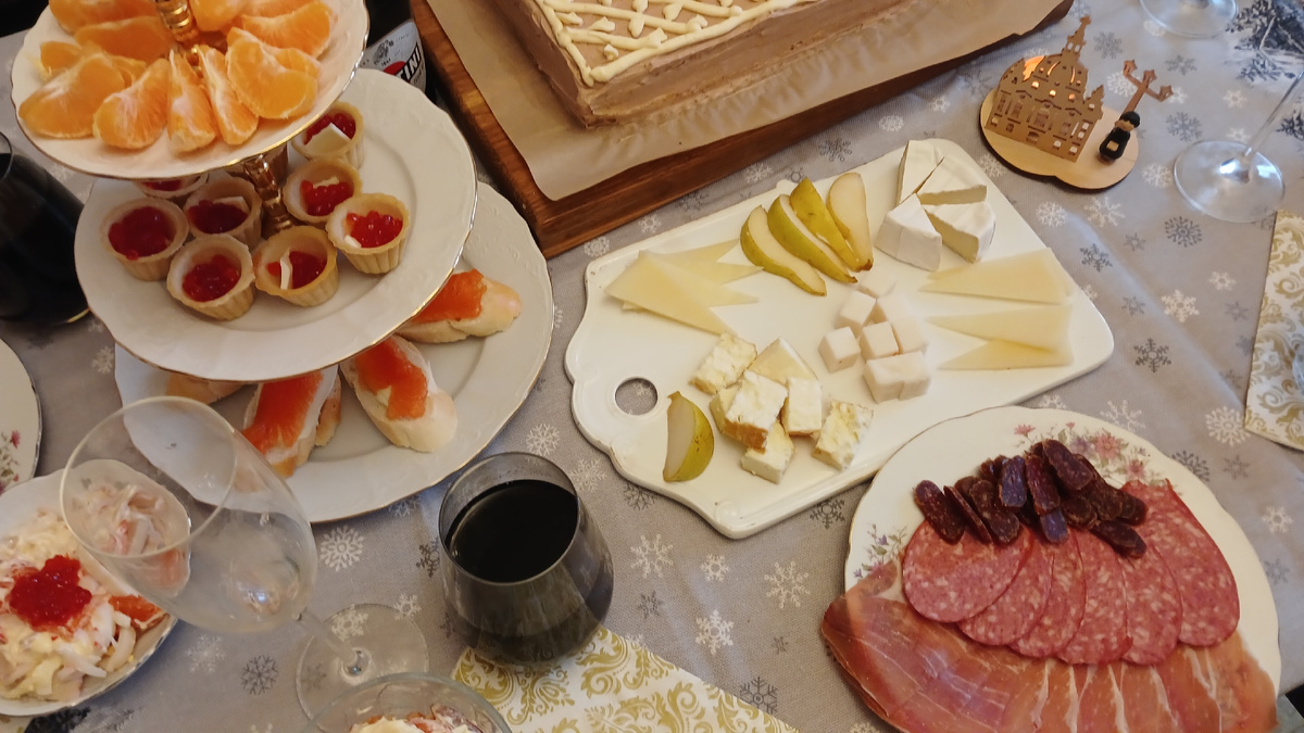 На январь я взяла сумму на питание в размере 70% от прожиточного минимума. На человека это 250 руб в день, в месяц - 7 739 руб. В первые дни января, как и вся страна, доедаем остатки с новогоднего стола. 🤗 Завтрак я уже показывала отдельно, поэтому здесь поставлю только общее фото. Сырная доска, мясные нарезки, бутерброды с форелью, тарталетки с икрой, фрукты, салат "Морской" и на десерт кофе с "Киевским" тортом Завтракали поздно, с шашлыками тоже долго провозились. Поэтому дальше был обедоужин: запекала в духовке картошку, к ней - шашлыки из свиного окорока и помидоры под сыром Я между завтраком и обедом еще кофе с сыром пила Меню год назад