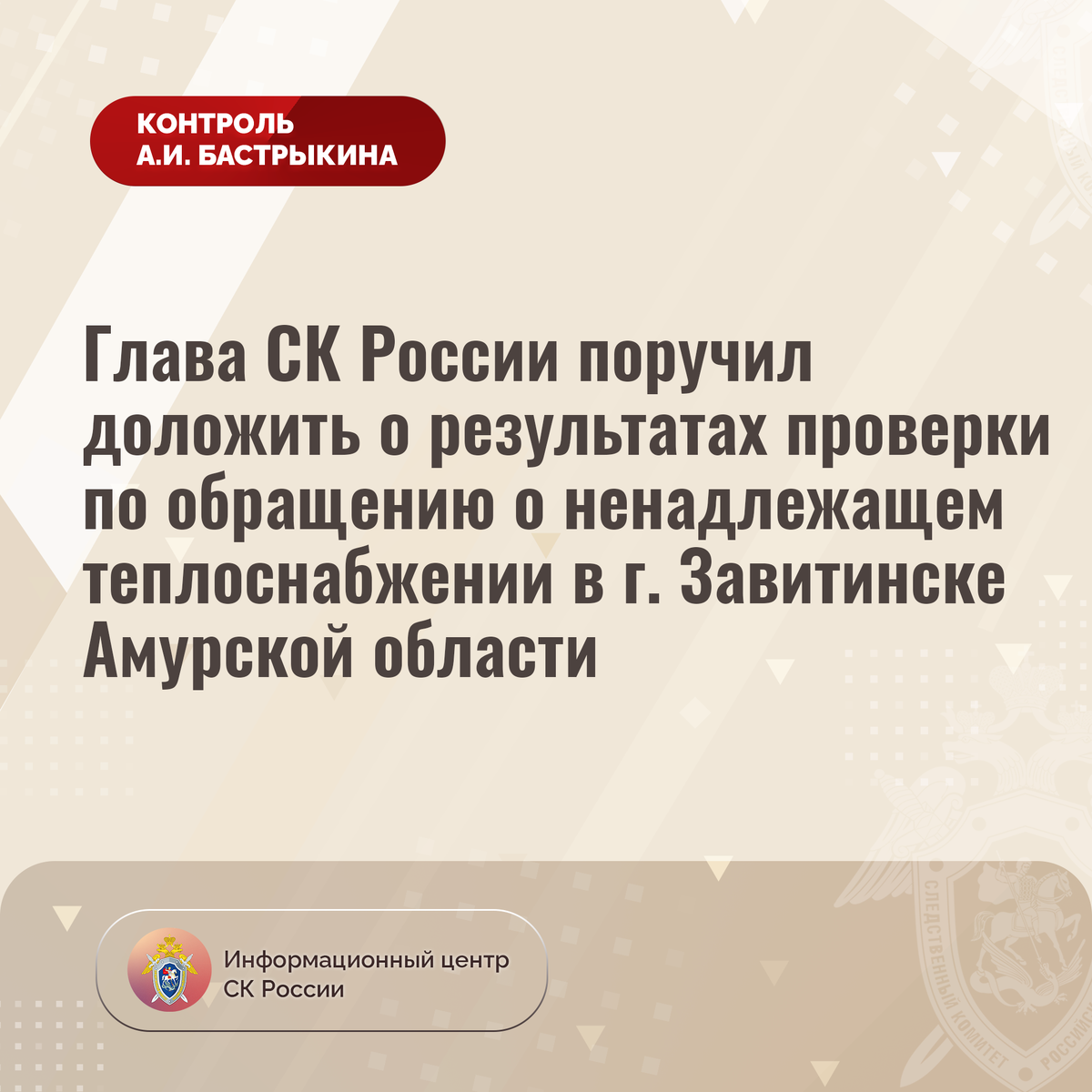 Глава СК России поручил доложить о результатах проверки по обращению о ненадлежащем теплоснабжении в г. Завитинске Амурской области В комментариях в аккаунте приёмной Председателя СК России А.И. Бастрыкина «ВКонтакте» размещено обращение по вопросу нарушения прав жителей города Завитинска Амурской области на качественное теплоснабжение. Несмотря на низкую температуру воздуха, жилые помещения граждан и объекты социальной инфраструктуры отапливаются ненадлежащим образом ввиду неисправностей котельных и нехватки угля, температурный режим не соответствует установленным нормам. Многочисленные обращения граждан в различные инстанции результатов не приносят, мер к разрешению ситуации не принимается. В СУ СК России по Амурской области организована процессуальная проверка. Председатель Следственного комитета Российской Федерации Александр Иванович Бастрыкин поручил руководителю СУ СК России по Амурской области Алексею Сергеевичу Коротких доложить о промежуточных результатах процессуальной прове