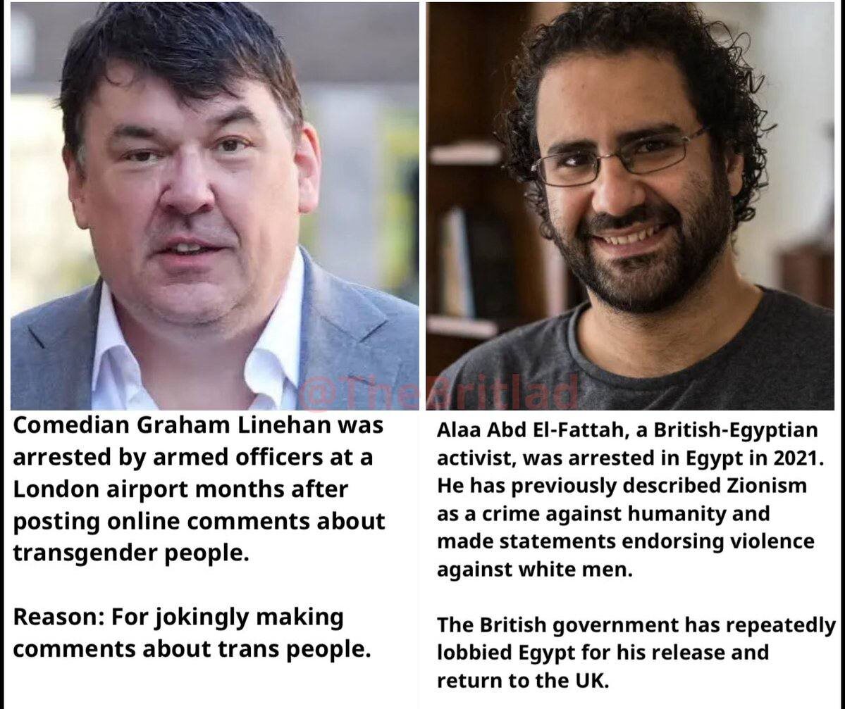 В подтверждение сказанного выше Белый мужчина (слева) был арестован по прибытии в лондонский аэропорт за комментарии в интернете. А вот египтяину (справа) разрешили въехать в Великобританию без лишних вопросов. Один из них высказал замечания о трансгендерных людях. Другой открыто призывал к убийству белых людей.