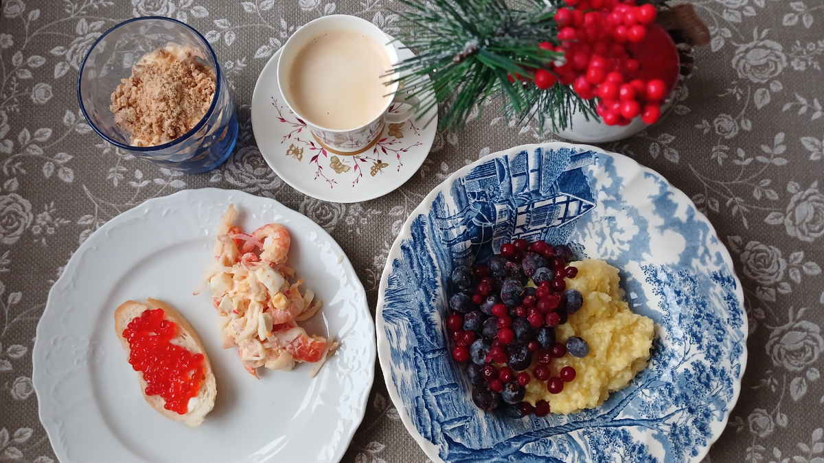 На январь я взяла сумму на питание в размере 70% от прожиточного минимума. На человека это 250 руб в день, в месяц - 7 739 руб. В первые дни января, как и вся страна, доедаем остатки с новогоднего стола. 🤗 Сварила пшенную кашу, в нее добавила голубику и бруснику Морской салат и бутерброды с икрой и на десерт - кофе с Киевским тортом в стаканах. У меня остались оба вида крема Шарлотт -шоколадный и обычный, обрезки от коржей. И я в стаканах собрала что-то типа трайфла, но с "Киевскими" коржами Напомню, что я стараюсь вообще никогда и ничего не выбрасывать. Это тоже один из главных секретов оптимизации питания. Все, что куплено, приготовлено, все съедается, используется в других вариантах блюд. Между завтраком и обедом кофепитие с копченым сыром, бутербродом и конфетой Обедали поздно, специально чтобы потом сразу в театр поехать: доели шашлык, картошку к нему запекли в духовке на гарнир плюс домашняя квашеная капуста 👍 И после обеда мы с младшим сыном укатили в театр на "Тайны Мадридск