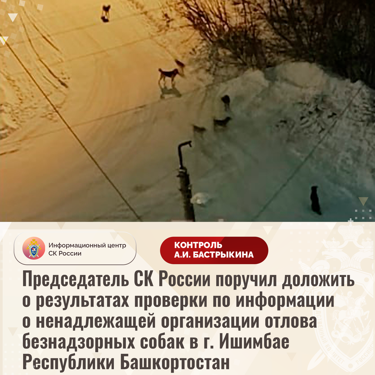 Председатель СК России поручил доложить о результатах проверки по информации о ненадлежащей организации отлова безнадзорных собак в г. Ишимбае Республики Башкортостан В сети Интернет сообщается о бездействии профильных структур в городе Ишимбае Республики Башкортостан при организации отлова безнадзорных собак. На протяжении длительного времени вблизи частных домов обитает большое количество животных без владельцев, из-за чего местные жители опасаются за свою безопасность, а также за жизнь и здоровье детей. Многочисленные обращения в уполномоченные органы результатов не принесли, мер к устранению нарушений не принимается. В СУ СК России по Республике Башкортостан организована процессуальная проверка. Председатель Следственного комитета Российской Федерации Александр Иванович Бастрыкин поручил руководителю СУ СК России по Республике Башкортостан Владимиру Владимировичу Архангельскому доложить о ходе и результатах процессуальной проверки. Исполнение поручения, а также ход процессуальной п