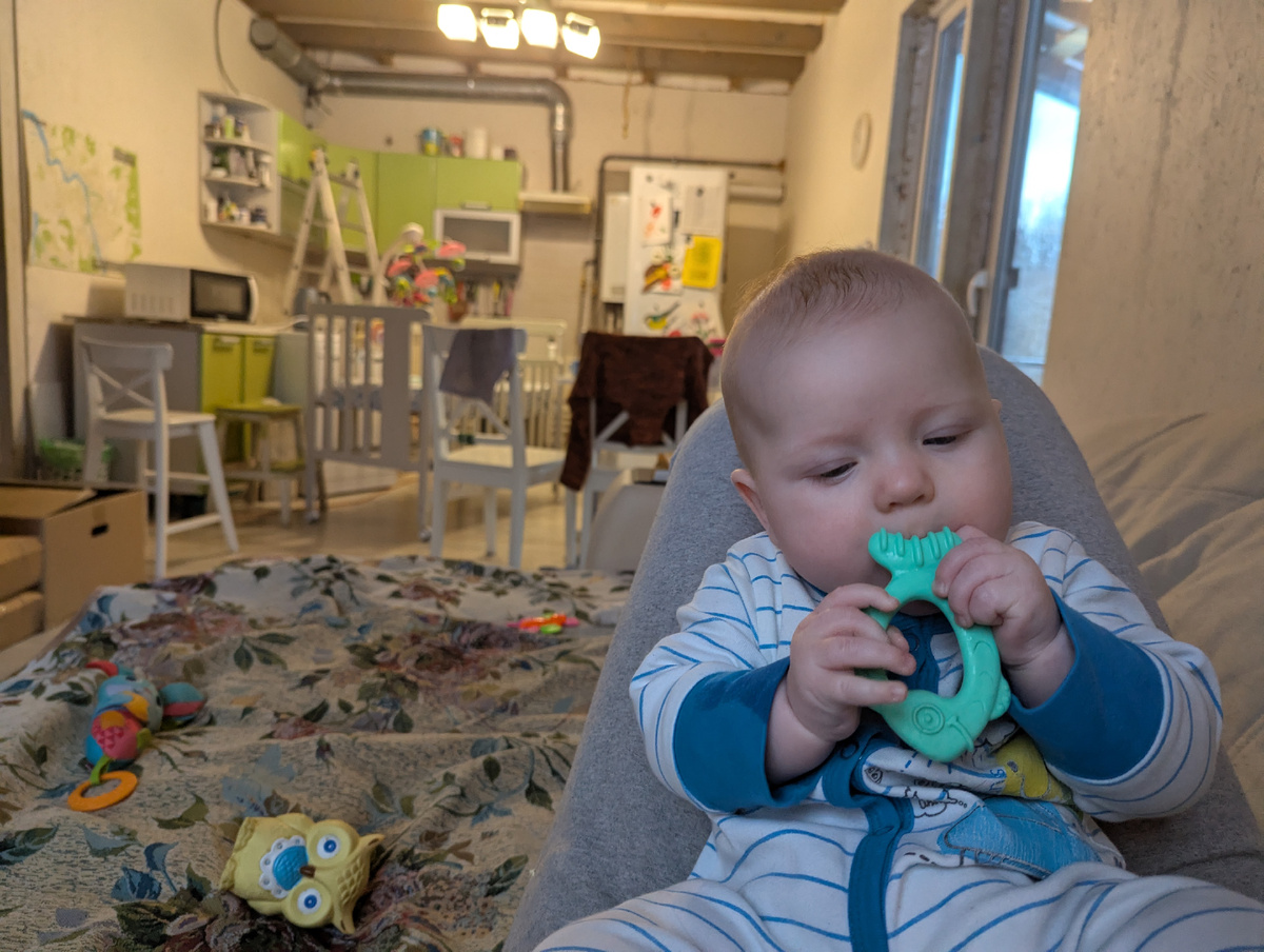 Женьке 4 месяца За предпраздничной суетой было как-то не до размышлений о младенце. И вот, каникулы, все дома и никуда не торопятся. Можно и подбить очередные итоги, что нового приобрел Женёк на этом отрезке жизни. Женя прогрессирует в ловкости рук - теперь он начал перебирать колечки, нанизанные на общую связку. Я всегда думала, наборы грызунков - это скорее для красоты. Нет, это для таких как Женя, ему нравятся перебирать пальцами предметы. Хотя, конечно, самыми удобными пока все равно остаются самые простые формы - палочки и колечки. А вот трясти погремушку, извлекая звуки - не его тема, по крайней мере пока. Серый кот, хоть и вернулся домой, редко показывается на глаза, только рыжего от миски гоняет. Рыжий жмется к хозяевам поближе. Наверное , поэтому Женя начал видеть рыжего кота. Ну, т.е. видеть-то он его,и наверное, и раньше видел, но никогда на него пристально не смотрел. Вероятно, кот для него сливался с пейзажем как подушка или неразобранный пакет. А теперь, когда активност