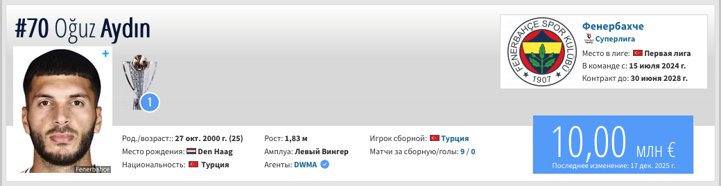 Айдын должен пройти медобследование и 13 января уже отправиться на первый сбор. Если брать прошлый сезон в Фенере, то за 30 матчей он забил 7 голов и отдал 8 голевых передач.