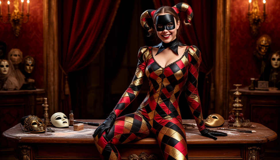 Знакомьтесь, ее зовут Арлекиной. Это тот самый персонаж, который позволяет нам не сходить с ума от серьезности. Эта женщина живет, чтобы доказать всем: если у тебя есть палка, пестрый костюм и наглость, ты – хозяин любого карнавала! С Арлекиной комедия дель арте превращается в анатомию соблазна! Она носит изящную полумаску из черного кружева, а ее облегающее трико вводит в грех даже статуи в садах Боболи. Она акробатка, и каждый ее прыжок – это вызов гравитации, а каждое «нечаянное» падение – это ловушка для твоего пульса. Случилось это в Венеции, которая в недалеком будущем окончательно оторвалась от дна лагуны и начала парить над водой, удерживаемая лишь ароматом капучино. Арлекина проникла в дом старого Панталоне – человека скупого до денег и еще более скупого на эмоции. На ней был корсет, состоящий из переливающихся ромбов – изумрудных, рубиновых и угольно-черных. Он был затянут так, что ее талия казалась не толще рукояти шпаги, а каждый вдох заставлял пестрые лоскуты ткани на ее