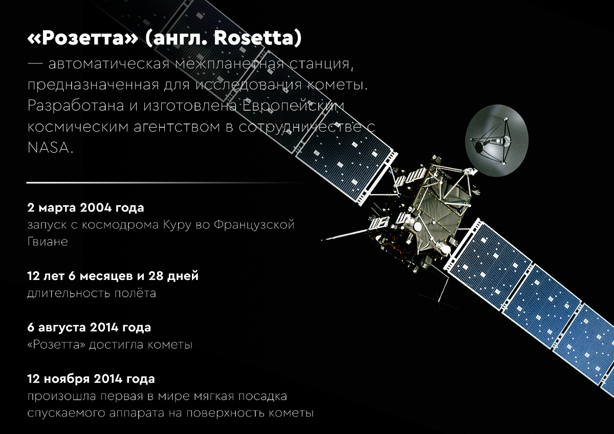 Именно этим космические археологи (планетологи), по сути, и занимаются. И их главный инструмент в начале тысячелетия — не лопата и кисточка, а 3-тонный ящик с антеннами, солнечными батареями и целой лабораторией инструментов, названный в честь того самого клочка базальта, что перевернул египтологию. «Розетта». Но между стартом с космодрома Куру в 2004-м и тихим финалом в 2016-м — пропасть. Пропасть длиной в шесть миллиардов километров.