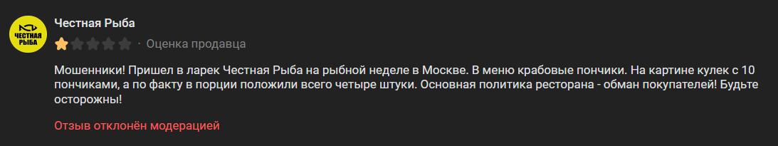 Ресторан Честная Рыба обманул. Оставил негативный отзыв на VK, но его не пропустила модерация самого ресторана! В Москве проходил рыбный фестиваль. На картинке в меню гигантский кулек с горой пончиков. Когда я их купил, был конвертик с малюсенькими 4-я штучками. Считаю это обманом и цыганщиной, не говоря о том, что ресторан нарушил ст. 10 Закона РФ «О защите прав потребителей» (от 07.02.1992 №2300-I). Согласно этой статье, изготовитель, исполнитель или продавец обязан своевременно предоставлять потребителю необходимую и достоверную информацию о товарах (работах, услугах), которая обеспечивает возможность их правильного выбора. Не верю в том, что если компания так обманывает в одном месте, то не обманывает своих посетителей в другом. Это прости ментальность торгашей, её ничем не перебьешь. В одном из московских ресторанов "Честная рыба" нашли кишечную палочку и золотистый стафилококк после жалобы посетительницы, что привело к временному закрытию точки и административной ответственности