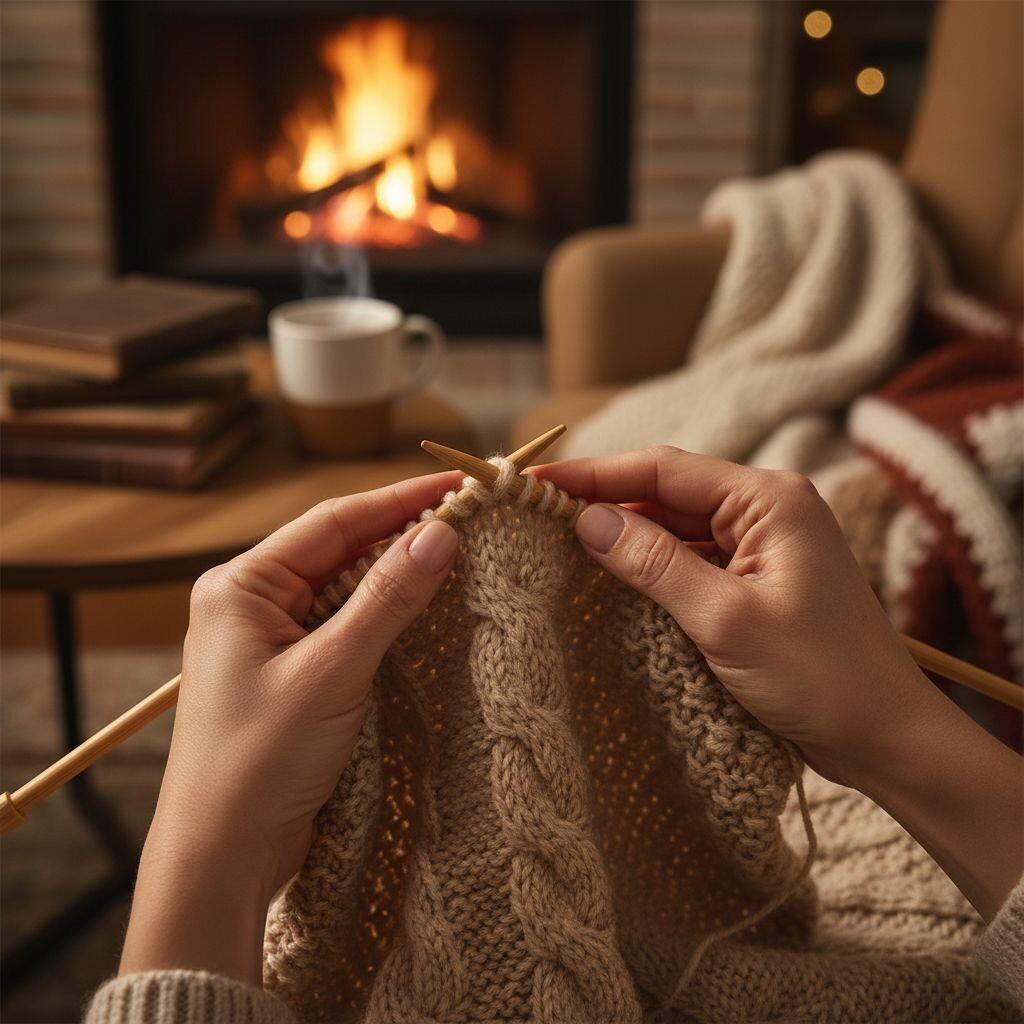 В реальности все так же пристраиваюсь с вязанием на любимом краешке дивана перед телевизором или в компьютерном кресле перед ноутбуком. Спицы и мотки можно найти в любой точке квартиры.