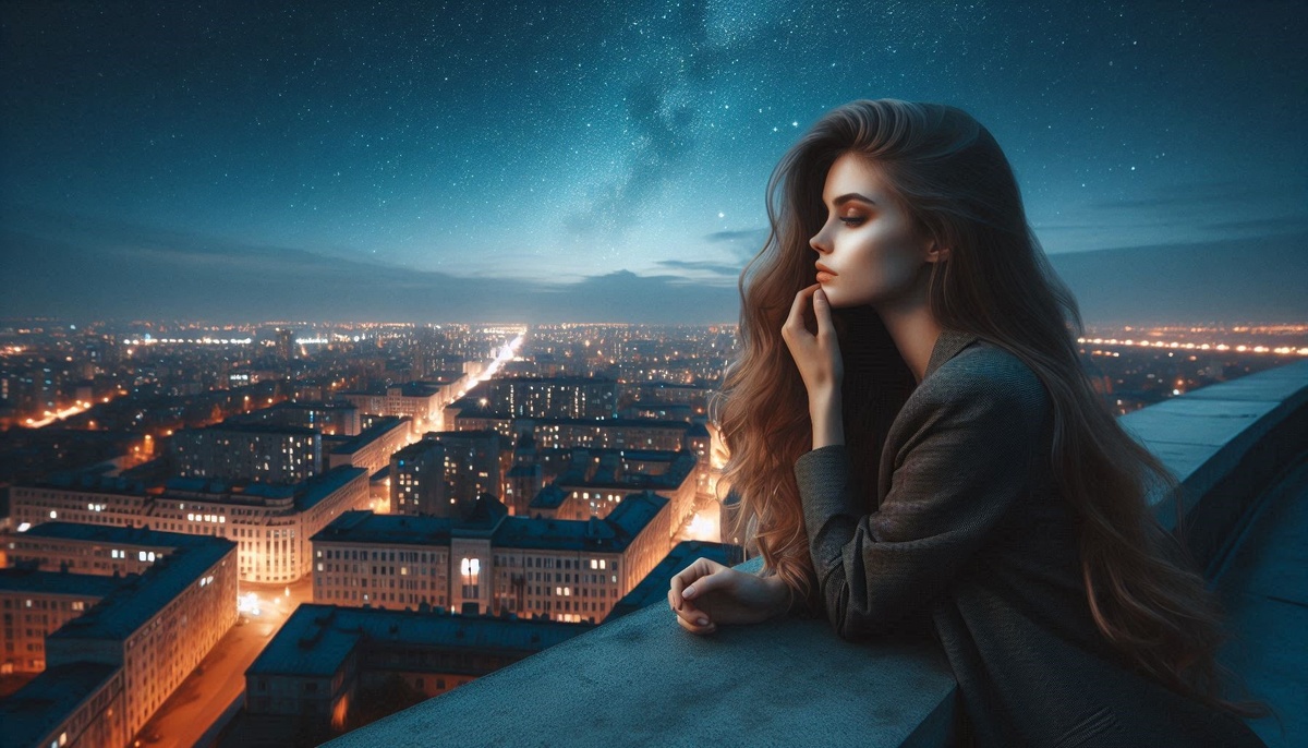 Катя поправила ленту на спинке кресла и удовлетворённо кивнула. Всё идеально. Она подошла к парапету. Вид отсюда открывался умопомрачительный: город внизу переливался миллионами огней, словно опрокинутое звёздное небо. Было тихо, только ветер гудел в металлическом плетении какой-то конструкции.