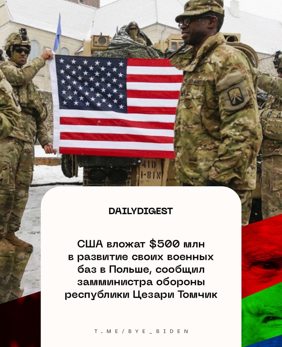 : 🔹США вложат $500 млн в развитие своих военных баз в Польше, сообщил замминистра обороны республики Цезари Томчик. 🔹Италия осталась главной по поставкам игристого вина в Россию по итогам января — сентября 2025 года. 🔹Все военнослужащие ОАЭ покинули территорию Йемена, сообщает Минобороны эмиратов. 🔹В Чехии оппозиция добивается отставки спикера палаты депутатов, который выступил против оказания военной помощи Киеву. 🔹Посольство РФ в Австрии направило протест в МИД альпийской республики из-за празднования украинскими радикалами в Вене дня рождения Степана Бандеры. 👍«БайБайден» в МАХ