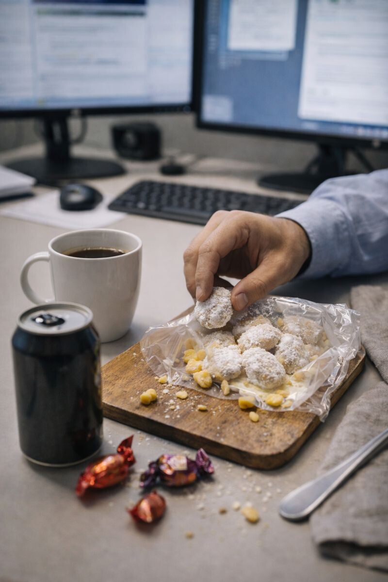 - Мозг орёт: “ДАЙ ЕЩЁ!” → ты берёшь ещё кофе, сладкое, печеньку.