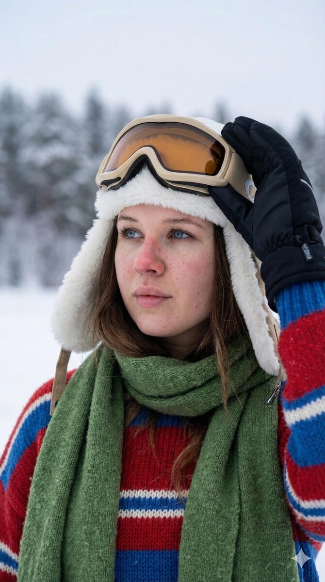 💌 (нажми чтобы скопировать) Фото 1 Ultra-realistic winter portrait photography, natural editorial realism, no beauty retouching. A close-up outdoor winter portrait in an overcast snowy environment. The subject is framed from chest up, photographed from a slightly lower angle. Head turned about 20–25 degrees to the left, gaze directed into the distance, not looking at the camera. Facial expression is calm, thoughtful, neutral, with relaxed facial muscles and slightly parted lips. Face has a natural oval proportion with slight asymmetry. Skin tone is light with subtle cold undertones, natural redness on cheeks and nose from cold air. Skin texture is fully preserved: visible pores, fine micro-imperfections, very light freckles, tiny natural moles on the cheek area. No smoothing, no plastic effect, no artificial glow. Eyes are medium-sized, almond-shaped, with a soft focused gaze. Upper eyelids slightly hooded, natural lower-lid shadowing. Eyebrows are natural, medium thickness, soft a