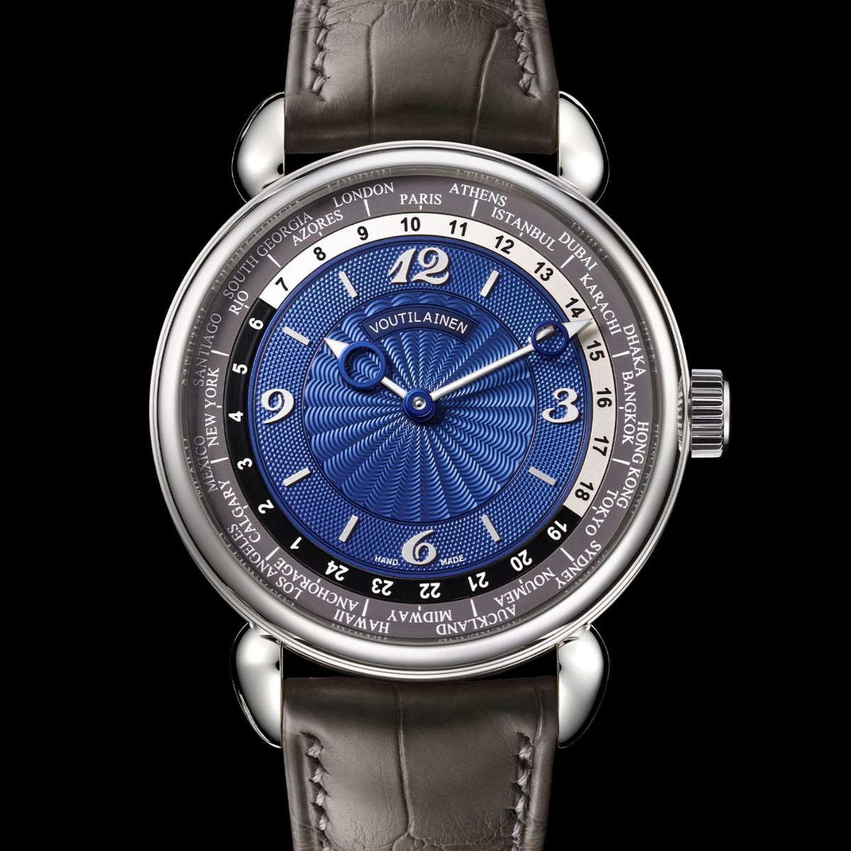 Kari Voutilainen представляет 216TMZ Worldtime - классические часы с функцией мирового времени в круглом корпусе из нержавеющей стали. Модель сочетает традиционный дизайн с инновационным механизмом, впервые показанный в CSW Worldtime 2023 года. Синий гильошированный циферблат и частичная кастомизация подчёркивают эксклюзивность. Корпус и дизайн Круглый корпус диаметром 39 мм из нержавеющей стали с полированной отделкой и характерными ушками в форме капли. Сапфировые стёкла спереди и сзади с антибликовым покрытием открывают вид на циферблат и механизм. Серый ремешок из крокодиловой кожи с ручной строчкой. Циферблат Синий центральный диск с ручным гильоше (волновой узор в центре и концентрический на кольце). Серое кольцо городов по системе Louis Cottier с вращающимся периферийным диском. Двухцветное 24-часовое кольцо (бежевое/чёрное) для индикации дня/ночи. Золотые индексы и арабские цифры в стиле Breguet на 12, 3, 6 и 9 часах. Центральные стрелки из белого золота с синими полыми након