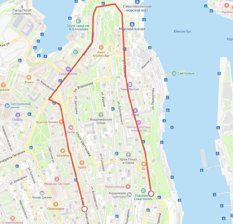 🔹 в центре города — от площади Суворова до ул. Большая Морская, 36 (Покровский собор);