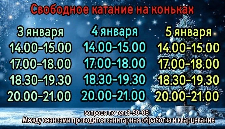 Ледовый дворец "Юность" приглашает посетить сеансы свободного катания на коньках. Между сеансами проводится санитарная обработка и кварцевание. Тел. 3-50-08