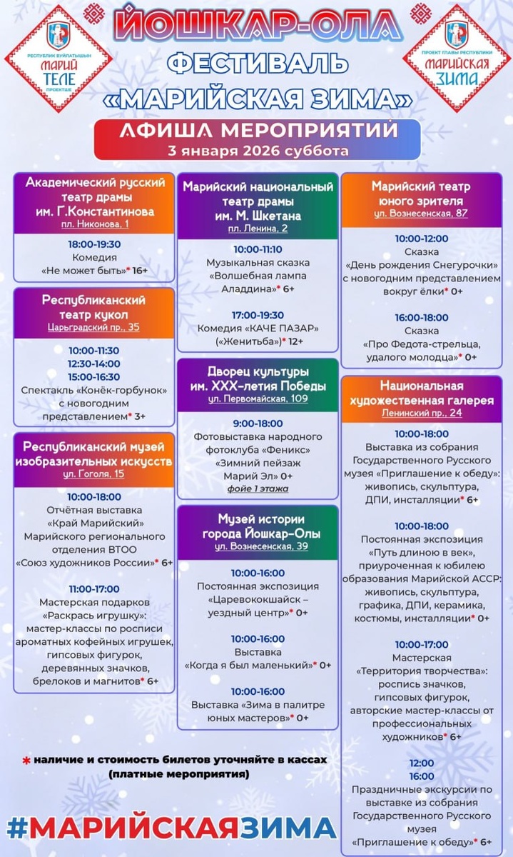 » 🎅 На площади им. В.И. Ленина пройдут интерактивная программа, литературно-игровой серпантин, мастер-класс по катанию на коньках, будут работать аттракционы, резиденция Деда Мороза и Снегурочки. 🎡 В Центральном парке культуры и отдыха планируются детско-тематическая анимация, поздравление от главного волшебника, светомузыкальное шоу. 🎿 В парке Победы ожидается слет «нордиков» по северной (скандинавской) ходьбе. 🎨 Республиканские культурные учреждения проведут мастер-классы и организуют выставки, а театры представят новогодние спектакли. Напоминаем, что проект «Марийская зима» инициирован главой Марий Эл Юрием Зайцевым.