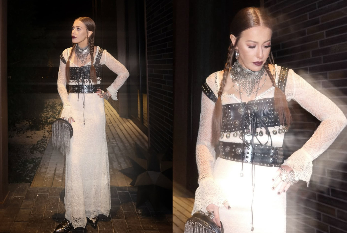 Мы продолжаем разбирать новогодние образы звёзд в деталях. Этот образ, когда я его увидела, привёл меня просто в восторг. Я даже не знаю, как точнее описать это чувство. Он моментально попал в мои личные референсы того, как сегодня нужно создавать сложные, эклектичные образы. Перед нами именно такой случай. В этом выходе Ксения Собчак показывает не просто праздничное платье, а целую визуальную историю. В образе есть две ключевые составляющие, которые делают его по-настоящему запоминающимся. Белое платье паутинка с нежной, почти невесомой фактурой и кожаные декоративные элементы, которые добавляют жёсткости и характера. Именно в этой точке встречаются хрупкость и готика, свет и тьма, нежность и сила. За счёт этого образ хочется рассматривать долго, возвращаться к деталям, замечать всё новые акценты. Это тот редкий случай, когда эклектика не выглядит хаотичной. Напротив, она выстроена очень точно. Тотал лук от Alexander McQueen здесь работает безупречно. Белое кружево словно отсылает к